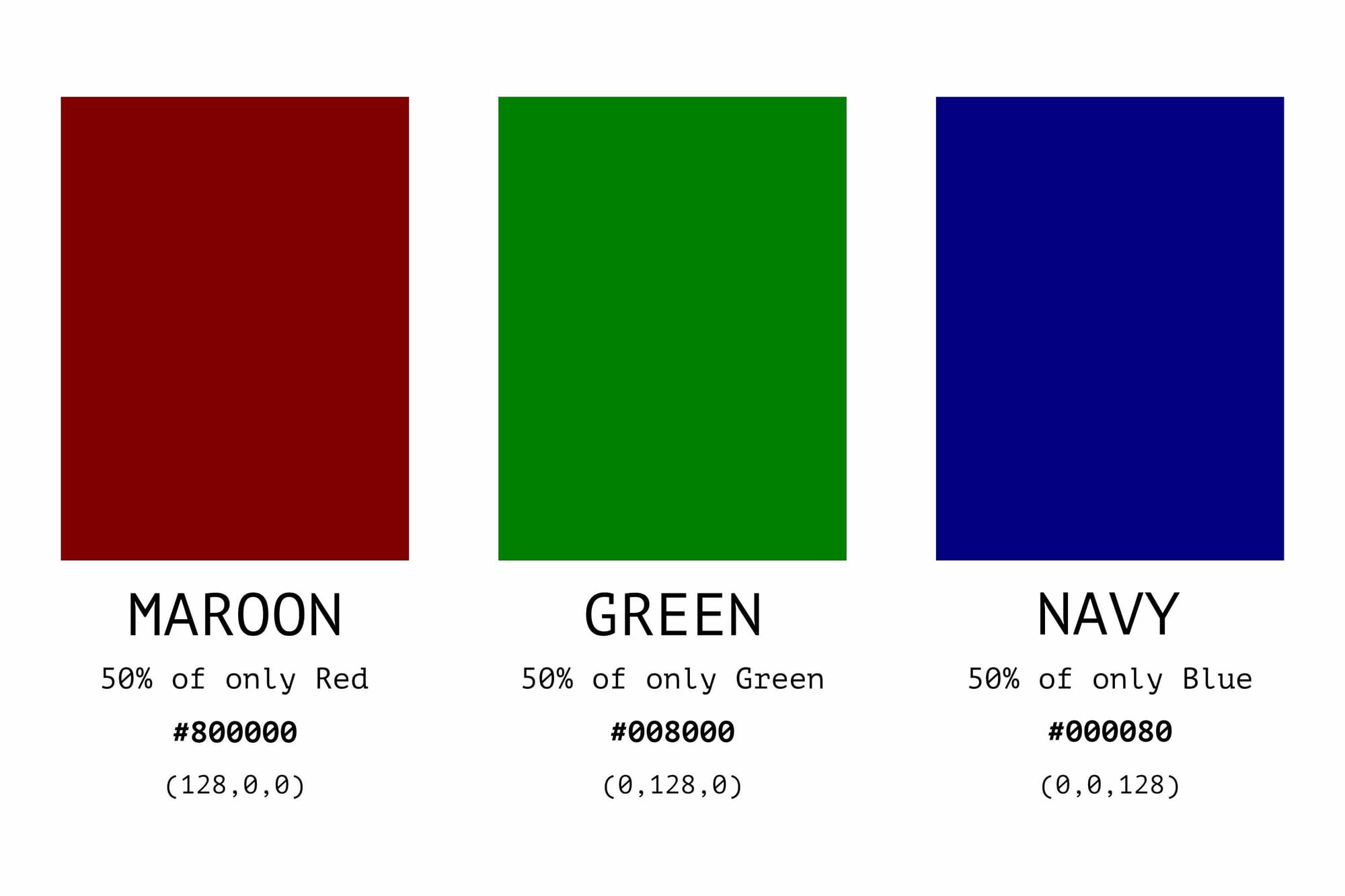 We start seeing the issues when we try 100% and 50% of a single color. 50% of green looks more like baseline green than 100% green which looks more like lime green. We can empathize with whoever named these colors, because it is easy to see what they were trying to do.