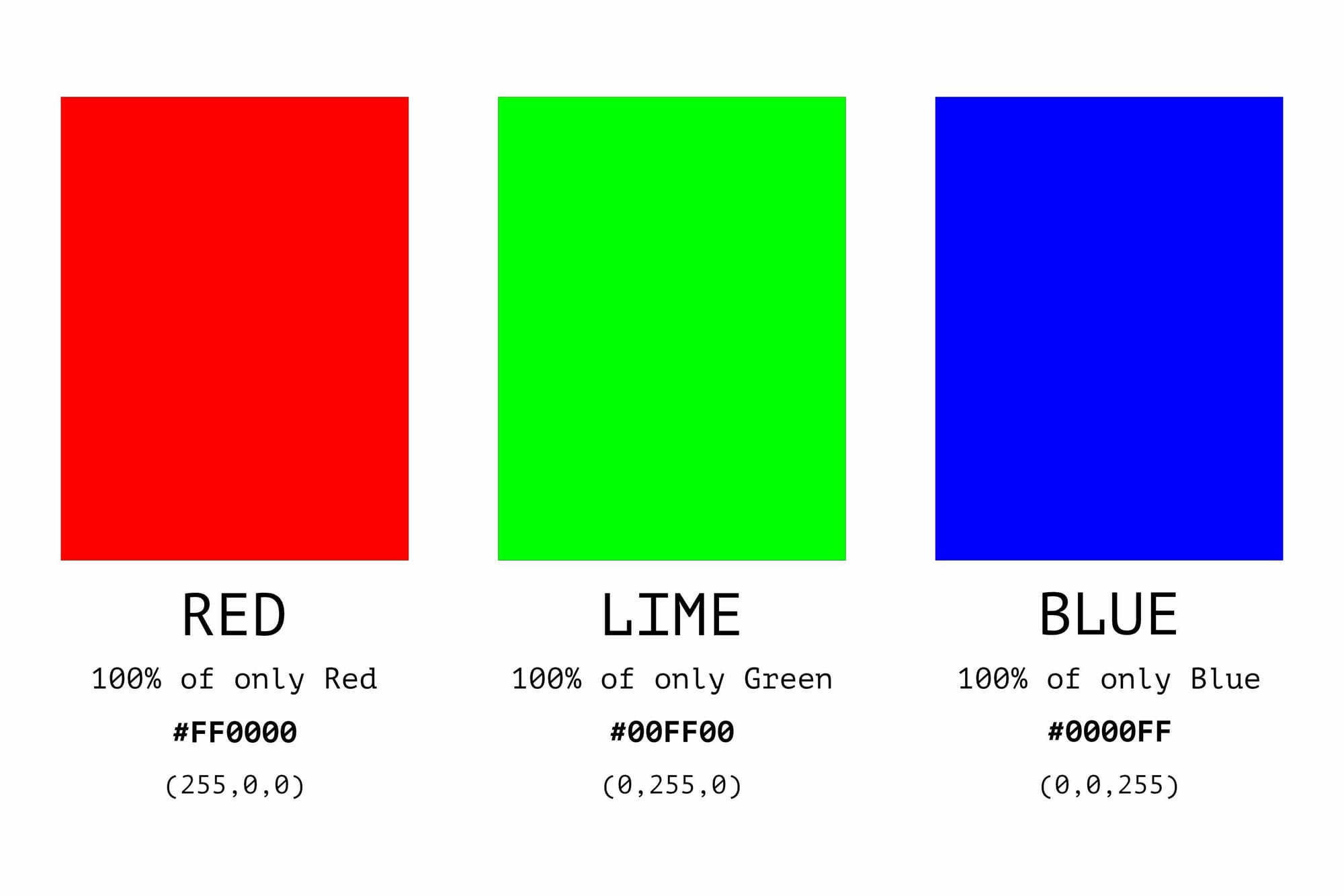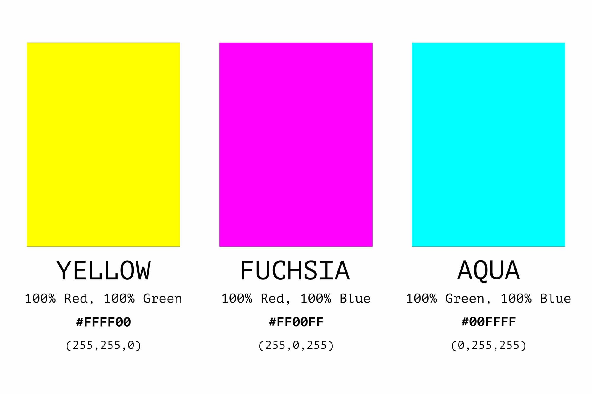 Every RGB color on the web has a hash symbol (#) followed by three pairs of hexadecimal numbers (0-9, A-F), representing the quantities of red, green, and blue. In total, you could possibly generate 256³ or 16,777,216 different colors, from black (#000000) to white (#FFFFFF). Another equivalent way to write the RGB composition of white, for example, is 255, 255, 255, which means that it is using the maximum of each red, green, and blue.